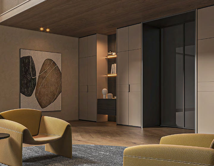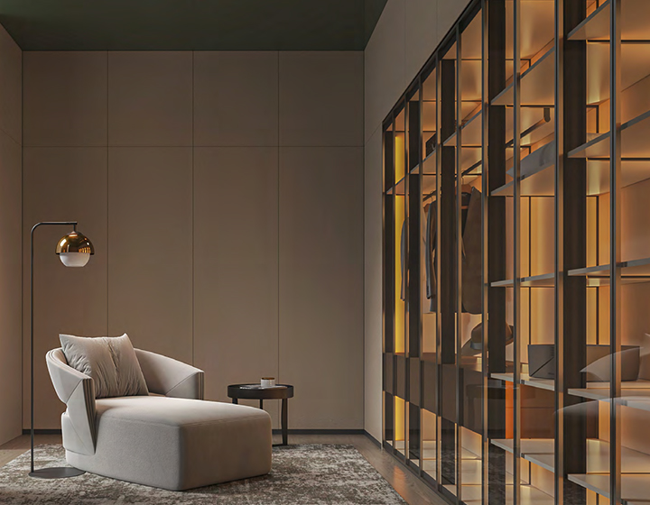 柜內(nèi)線燈位于立柱槽口向內(nèi)照射,不刺眼,且光線不會被懸掛的衣物等收納物品遮擋,方便物品的取用。